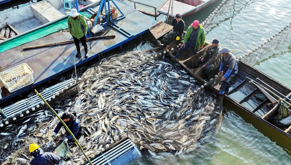 Прясна риба се изважда от водата и се доставя на нетърпеливи клиенти в езерото Liuye в Changde, провинция Hunan. [Photo by Zhang Weihua / chinadaily.com.cn]