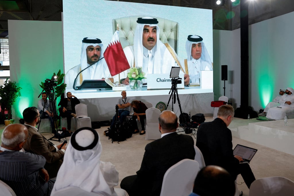 Екран показва, че Емир на Катар говори в понеделник на спешната арабско-ислямска среща на върха, за да обсъди атаката на израелската атака на катарската почва. Снимка: Ройтерс