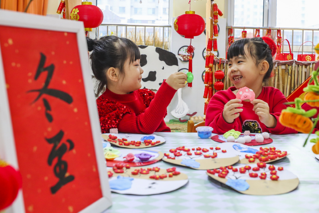 Деца показват кнедли, които току-що са направили с помощта на своите учители в детска градина в град Лянюнганг, провинция Дзянсу в Източен Китай, 18 декември 2025 г. [Photo/Xinhua]