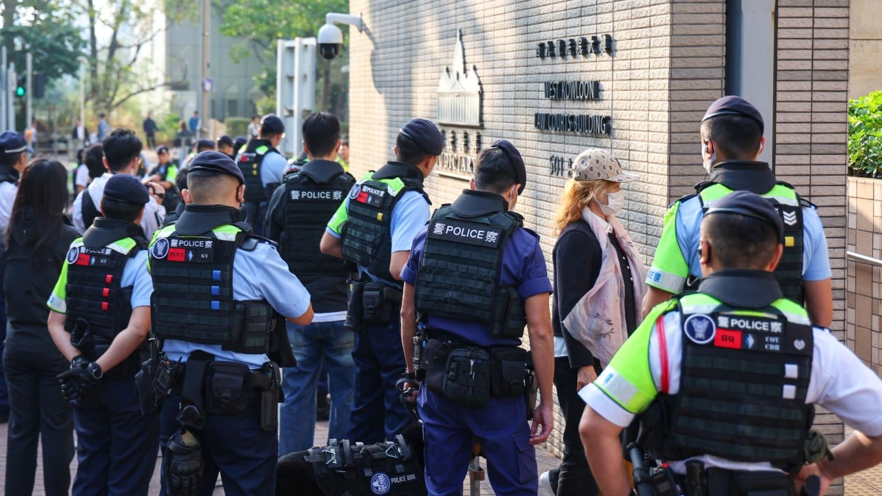 Засилено полицейско присъствие беше забелязано пред West Kowloon Court в понеделник сутринта, като около 100 служители бяха разположени на входа и поставиха блокада по протежение на пътя в близост до сградата.