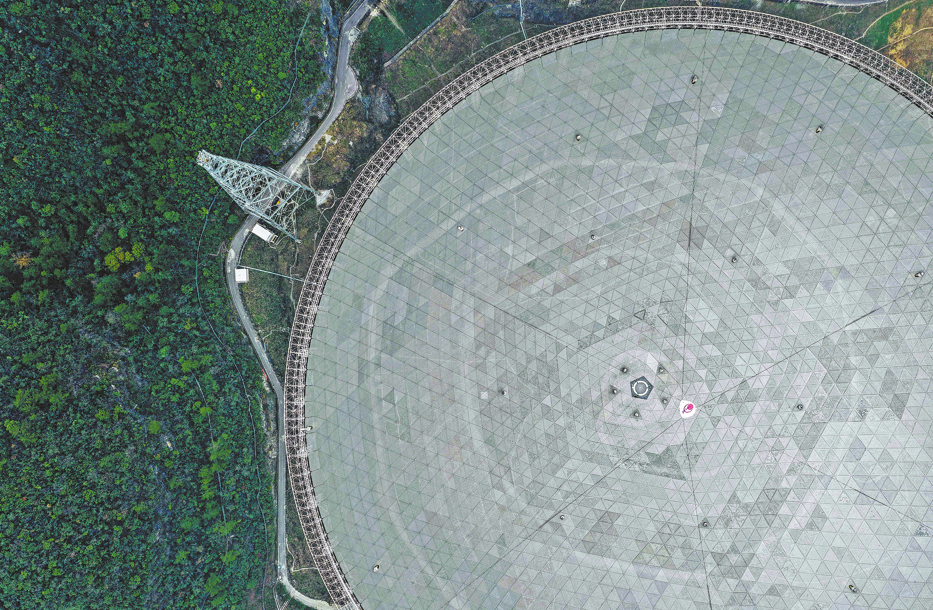 Снимка от въздуха, направена в петък, показва петстотинметровия сферичен радиотелескоп с апертура на Китай, или FAST, в процес на поддръжка в провинция Гуейджоу. Ou Dongqu/Xinhua